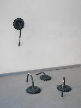 Claude Eigan (lives and work in Berlin) uses sculpture as a primary medium, often extending to installation, sound and printed material. In her practice, she often uses the symbolism of everyday most unnoticed objects as a starting point to draw a much bigger immersive narrative, relating to politics, labor and work, and the effects of capitalism. Recent exhibitions include: Cloak of Mercy (Horse & Pony Fine Arts, Berlin, 2019), Hear the Lizards Listening (Mélange, Köln, 2019), Fest (La Placette, Lausanne, 2018), A Strong Desire (PS120 Gallery, Berlin, 2018), Augmented Sunrise Beneath the Skin (Gr_und, Berlin, 2018), Sun Sipping Some Syrup (Frontviews, Berlin, 2018). Lean (2018 – 19) is a series of grayscale flowers. Their stems are filled with a codeine-based cough syrup mixture ‘Purple drank‘ or ‘Lean‘, a drink originating from Houston, Texas, where it became popular amongst writers in the 1960s and experienced a revival in the Hip Hop scene of the 1980s and 90s. Eigan’s Lean is a take on the pharmaceutical industry, examining how the over-consumption or recreational abuse of prescription drugs through their accessibility can act as a form of oppression in which their users, like the drooping flowers, are no longer alert to their surrounding, but enter a state of withdrawal, where the mind becomes gooey. When my plane crashed into the soft mountains of your body (2017) is an object as strange as it is sad. Though broken and rendered useless, this neck pillow speaks of the double bind of comfort and control, mobility and stasis.